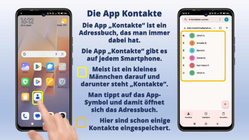 - Die App Kontakte ist ein Adressbuch, das man immer dabei hat.