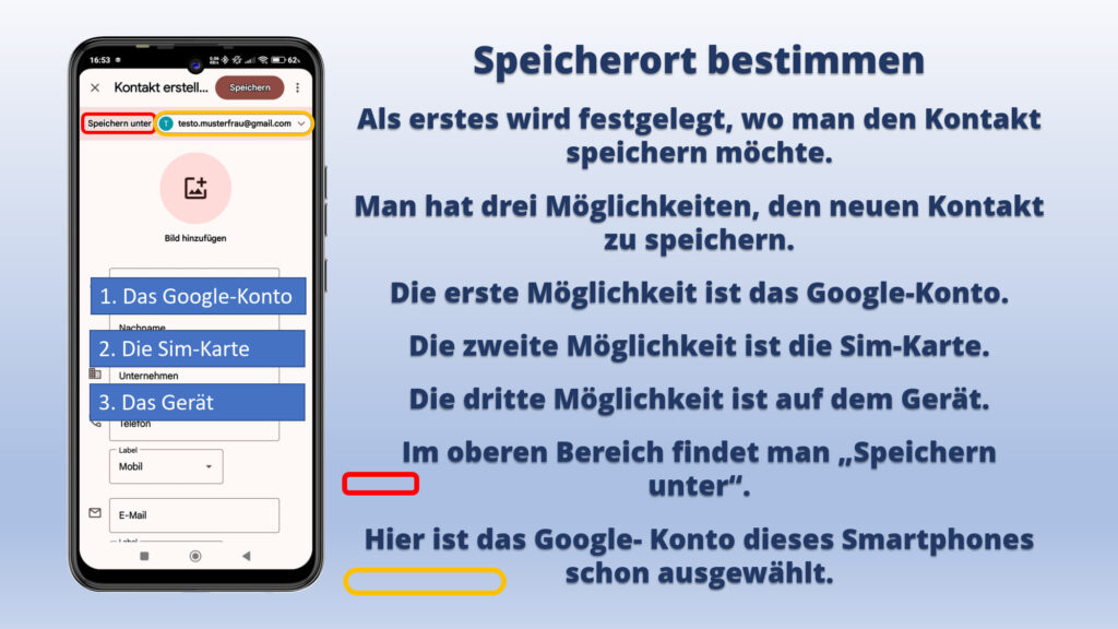 - Man sollten darauf achten, wo der Kontakt abgespeichert wird.