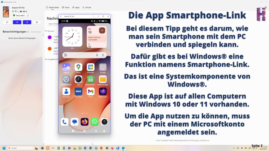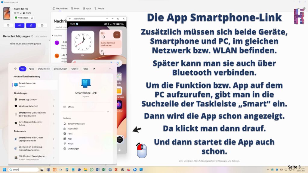 In den drei Bildern oberhalb sieht die Desktopoberfläche der App auf einem PC. Davor erkennt man die gespiegelte Oberfläche des Smartphones, das mit dem PC verbunden ist. Mit der App kann man zum Beispiel einzelne Bilder direkt per „Drag and Drop“ auf den PC oder in Dokumente kopieren.
