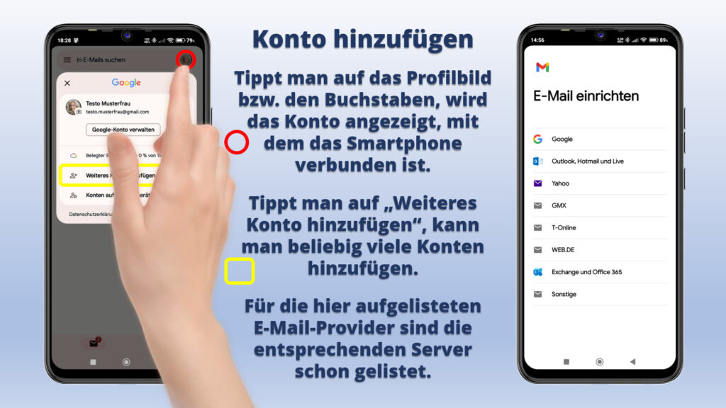• Es wird gezeigt, wie man sieht, mit welchem E-Mail-Konto man verbunden ist und wie man das Konto wechseln kann.
