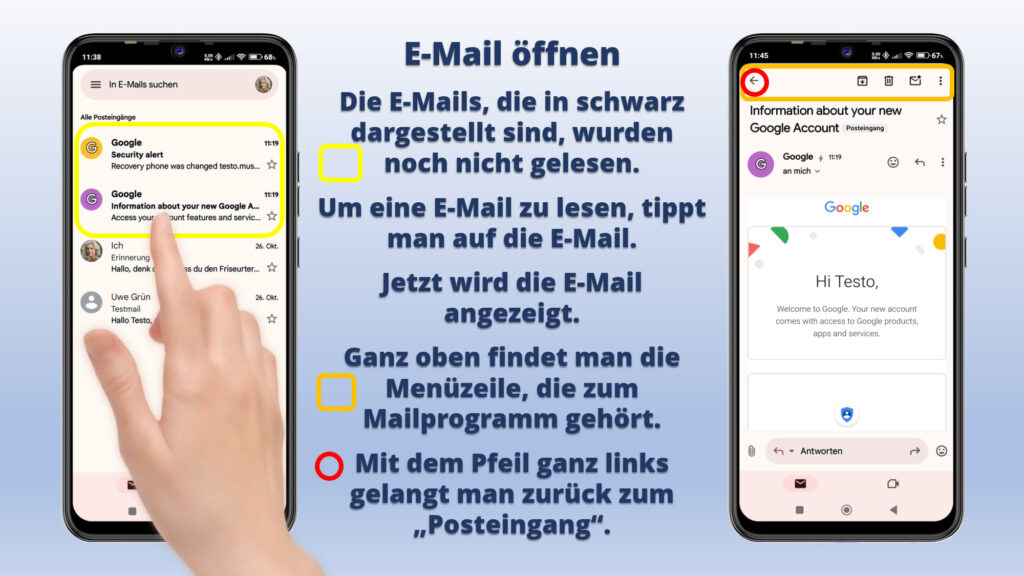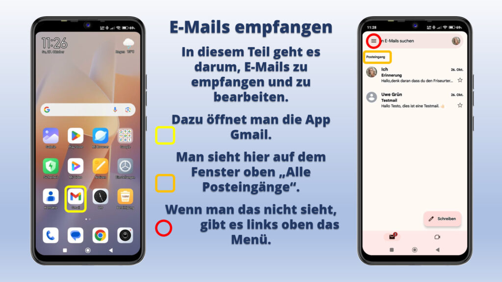 Heute kann man sich sehr einfach eine E-Mail-Adresse auf seinem Smartphone erstellen und über die App Gmail E-Mail-Nachrichten senden und empfangen.