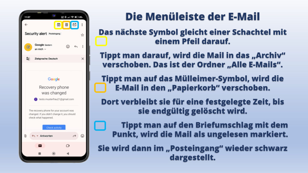Außerdem wird gezeigt, was passiert, wenn man eine E-Mail mit Foto erhält und wie man dieses Foto auf seinem Smartphone abspeichern kann.