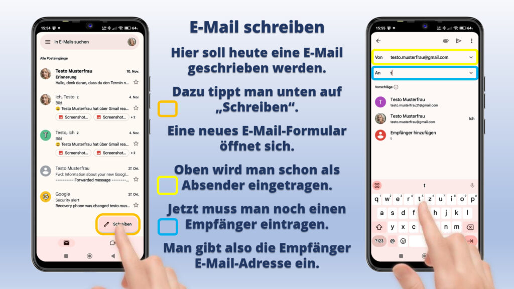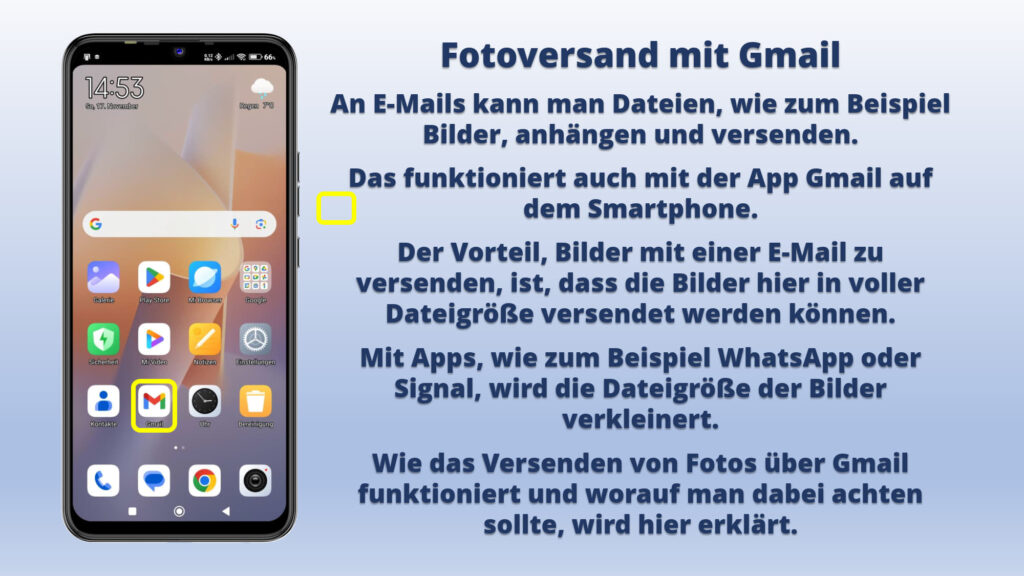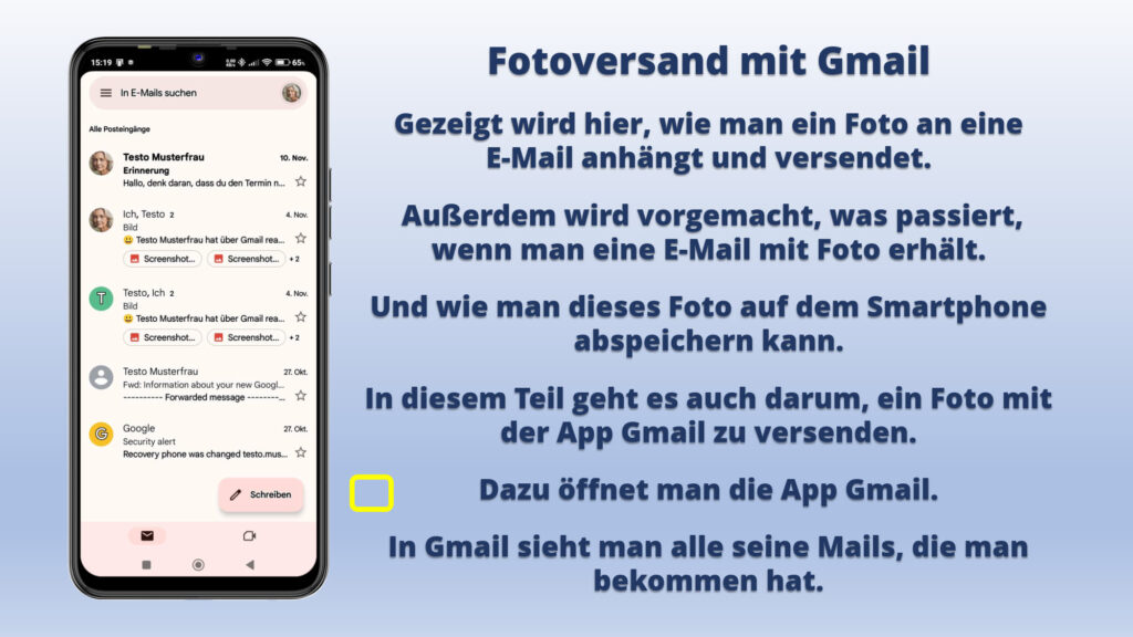 • Außerdem wird gezeigt, was passiert, wenn man eine E-Mail mit Foto erhält und wie man dieses Foto auf seinem Smartphone abspeichern kann.