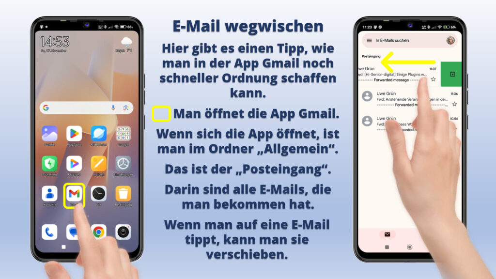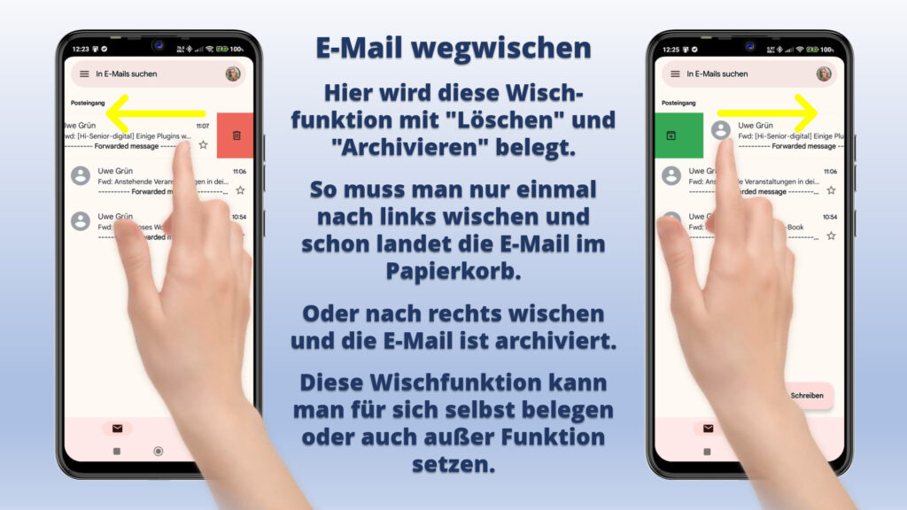 • Man kann die E-Mails in Ihrem Posteingangsordner nach links oder rechts wegwischen.