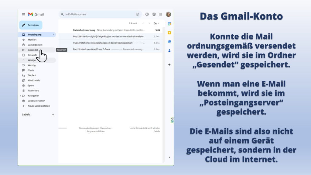 Es werden alle Schritte einmal vorgemacht und zum Schluss wird noch gezeigt, wie man sehen kann, ob die E-Mail auch versendet wurde.